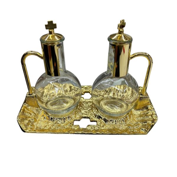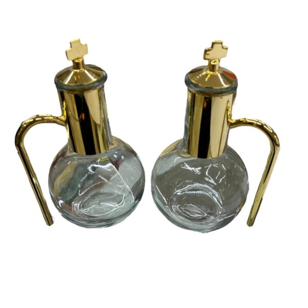 - CARATTERISTICHE: Coperchi decorati con croci dorate, ampolle dalla forma sferica con collo allungato per un versamento preciso