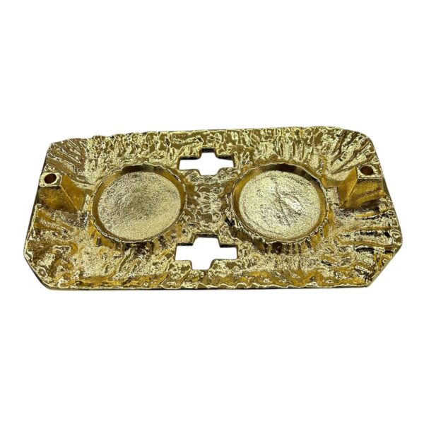 Questo elegante set di ampolle liturgiche è un’opera d’arte sacra che unisce funzionalità e bellezza. Il set include due ampolle in vetro cristallino dalla forma sferica, ciascuna con una capacità di 100 cc, perfetta per contenere acqua e vino durante le celebrazioni liturgiche. Le ampolle sono impreziosite da manici e coperchi in metallo dorato, coronati da distintive croci. Il vassoio di supporto, che misura 19×9 centimetri, presenta una finitura in oro fuso con una texture artistica che ricorda un paesaggio naturale. La base dorata non solo offre stabilità ma aggiunge anche un tocco di solennità all’insieme. I manici ergonomici facilitano il servizio, mentre i coperchi assicurano la purezza del contenuto. Questo set rappresenta una scelta raffinata per l’uso liturgico, combinando praticità e simbolismo sacro in un design armonioso che si adatta perfettamente all’ambiente ecclesiastico.