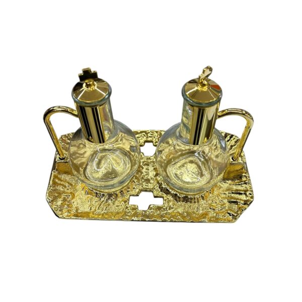 - DESIGN ELEGANTE: Set di ampolle liturgiche in vetro con finiture dorate e croci decorative, perfette per la celebrazione della Santa Messa