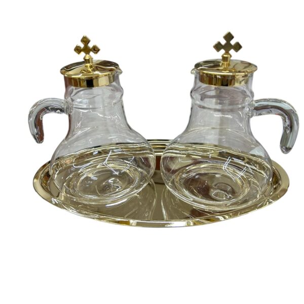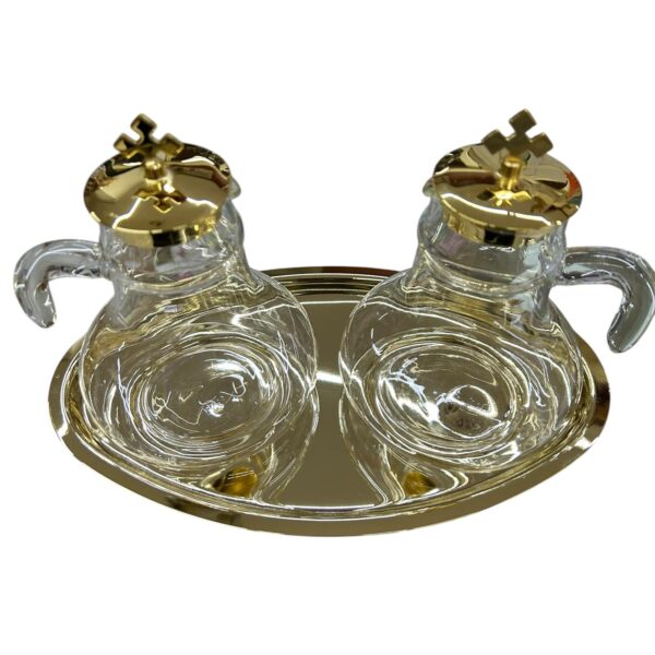 Set Ampolle da Messa con Vassoio in Ottone, Vetro Trasparente con Coperchi Dorati, 200cc, 23×14 cm