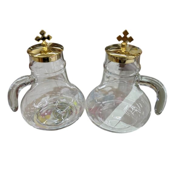 • DESIGN ELEGANTE: Set di ampolle liturgiche in vetro trasparente con coperchi dorati decorati con croci, ideale per la celebrazione della Messa