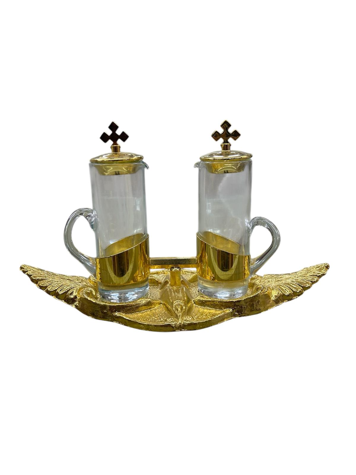 Set Ampolle da Messa con Vassoio, Vetro e Oro, 24×10 cm, 100 cc