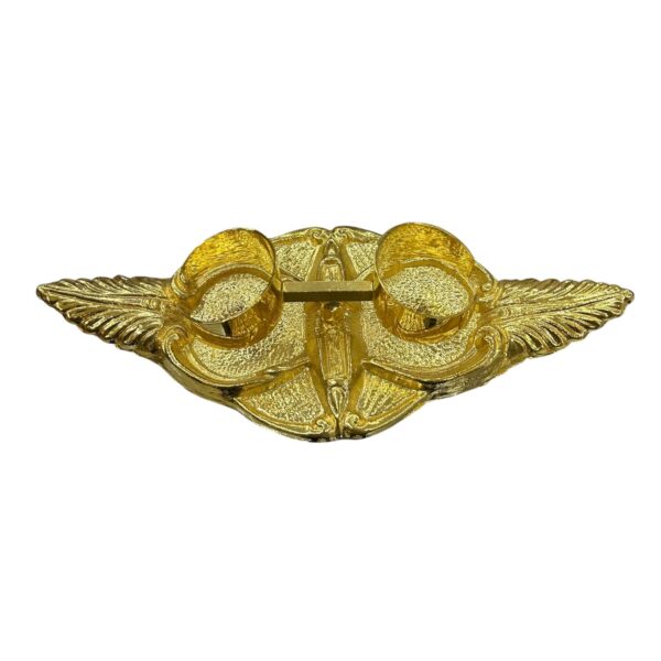 Questo elegante set di ampolle da messa con vassoio è un’opera d’arte liturgica di straordinaria bellezza. Il set include due ampolle in vetro cristallino dalla capacità di 100 cc ciascuna, impreziosite da coperchi dorati sormontati da croci. Le ampolle presentano dei manici ergonomici che ne facilitano l’uso durante le celebrazioni. Il vassoio decorativo a forma di palma, rifinito in oro, misura 24×10 cm e presenta dettagli finemente lavorati con motivi ad ali che conferiscono all’insieme un aspetto maestoso. La base del vassoio è arricchita da un motivo centrale in rilievo che aggiunge ulteriore raffinatezza al design. La combinazione di vetro trasparente e finiture dorate crea un contrasto elegante che si adatta perfettamente all’ambiente sacro. Le dimensioni contenute rendono il set pratico da utilizzare e riporre, mentre la qualità dei materiali garantisce durata nel tempo. Un complemento liturgico che unisce funzionalità e prestigio estetico.
