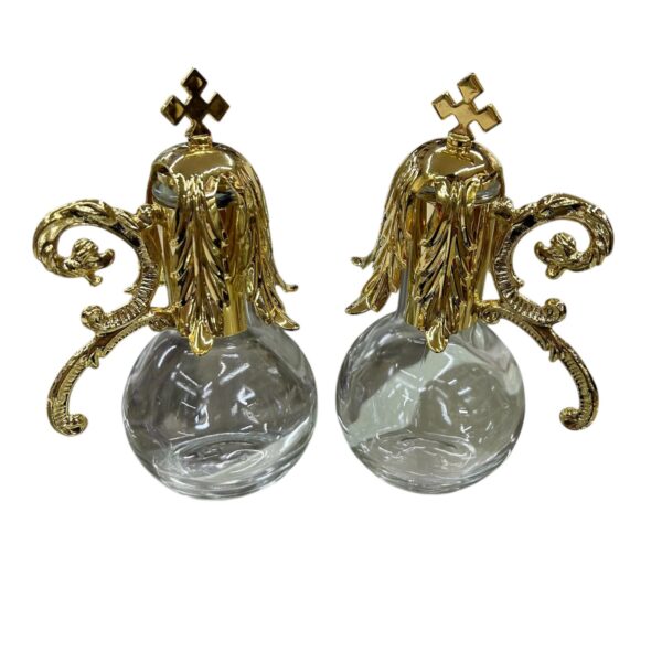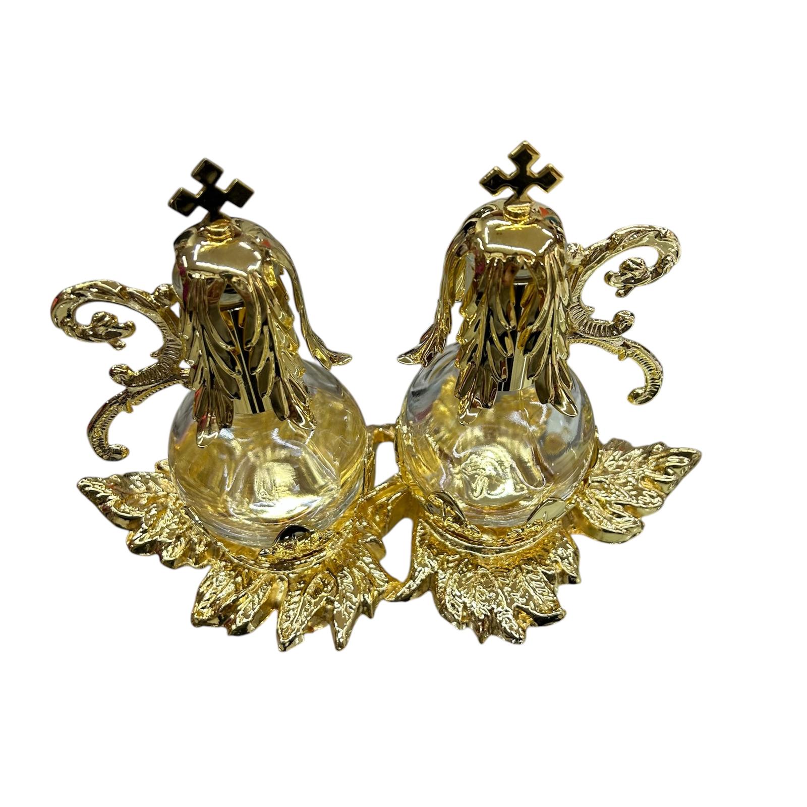 - DESIGN ELEGANTE: Set di ampolle liturgiche con finitura dorata, impreziosite da decorazioni floreali e croci sulla sommità