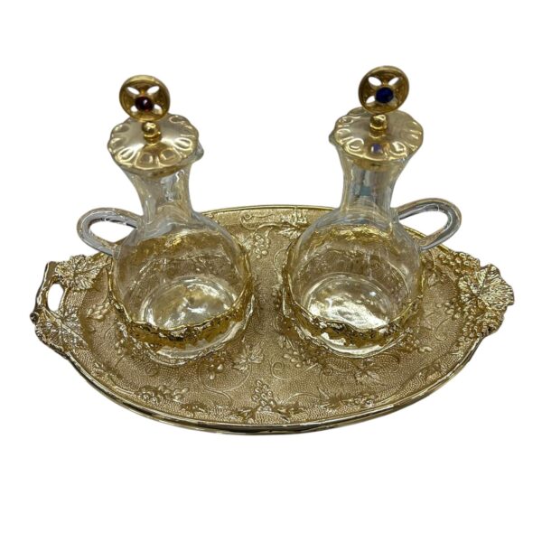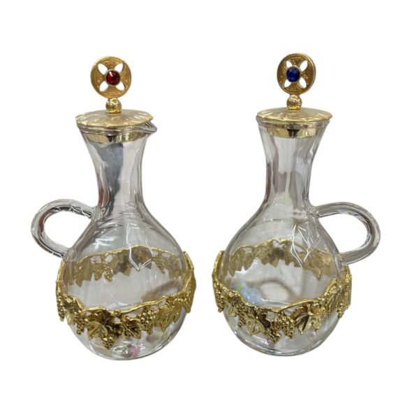 - DESIGN ELEGANTE: Set di ampolle liturgiche in cristallo con raffinati dettagli dorati e motivo decorativo a uva, ideale per la celebrazione della messa