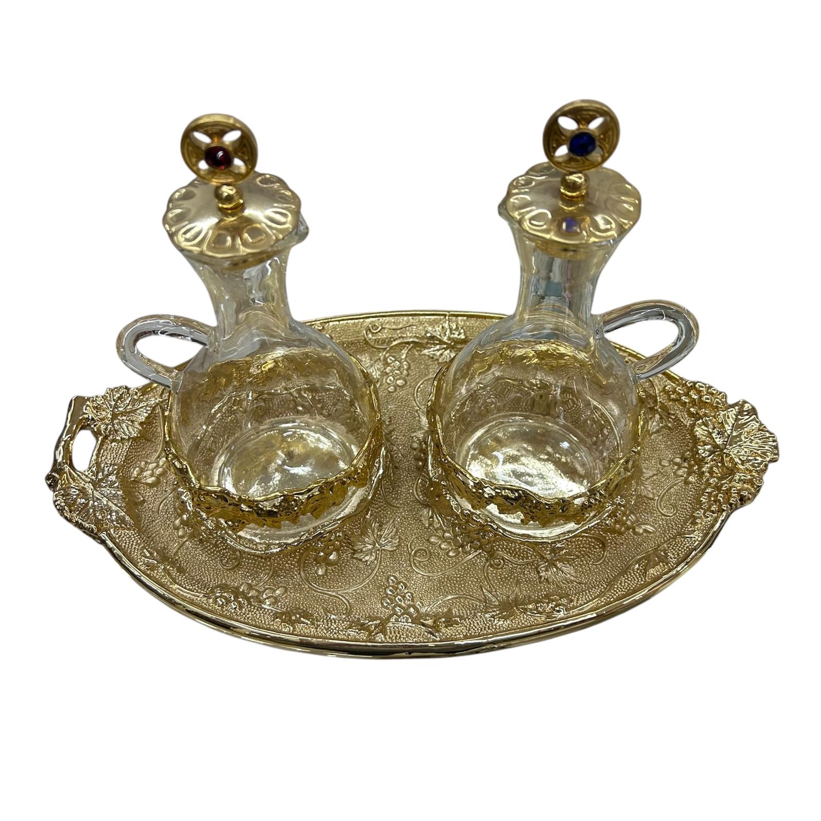 - DETTAGLI PREGIATI: Rifiniture dorate con motivo a uva in rilievo sia sulle ampolle che sul vassoio, creando un insieme armonioso e raffinato