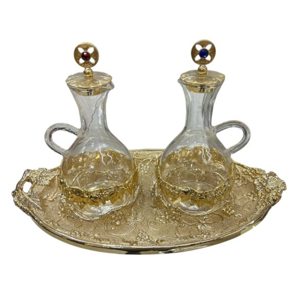 - SET COMPLETO: Include due ampolle in cristallo con manici ergonomici, coperchi decorativi con gemme rossa e blu, e un vassoio decorato coordinato