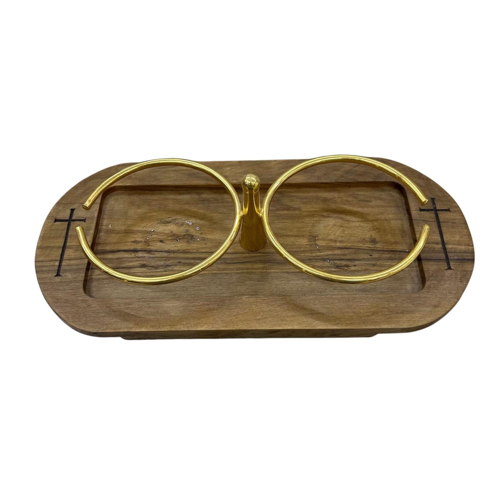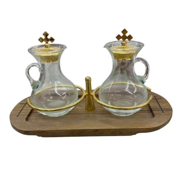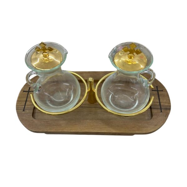 - SET COMPLETO: Due ampolle in vetro da 100 cc con manici ergonomici e coperchi dorati decorati con croci, presentate su un elegante vassoio in legno