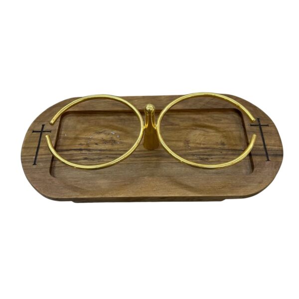 Questo elegante set di ampolle liturgiche comprende due raffinati contenitori in vetro trasparente da 100 cc ciascuno, perfetti per il servizio liturgico. Ogni ampolla è dotata di un manico in vetro per una presa sicura e di un coperchio dorato decorato con una croce distintiva. Il set include un pratico vassoio in legno naturale con supporti circolari dorati che mantengono le ampolle stabilmente in posizione. Il design classico e funzionale si integra perfettamente con l’arredo liturgico tradizionale. Le ampolle presentano una forma ergonomica che facilita il versamento e sono realizzate con vetro di alta qualità per garantire durevolezza nel tempo. Il vassoio in legno è decorato con sottili croci incise che ne sottolineano l’uso liturgico. L’insieme costituisce un set completo e raffinato, ideale per le celebrazioni liturgiche e perfettamente bilanciato tra estetica e funzionalità.
