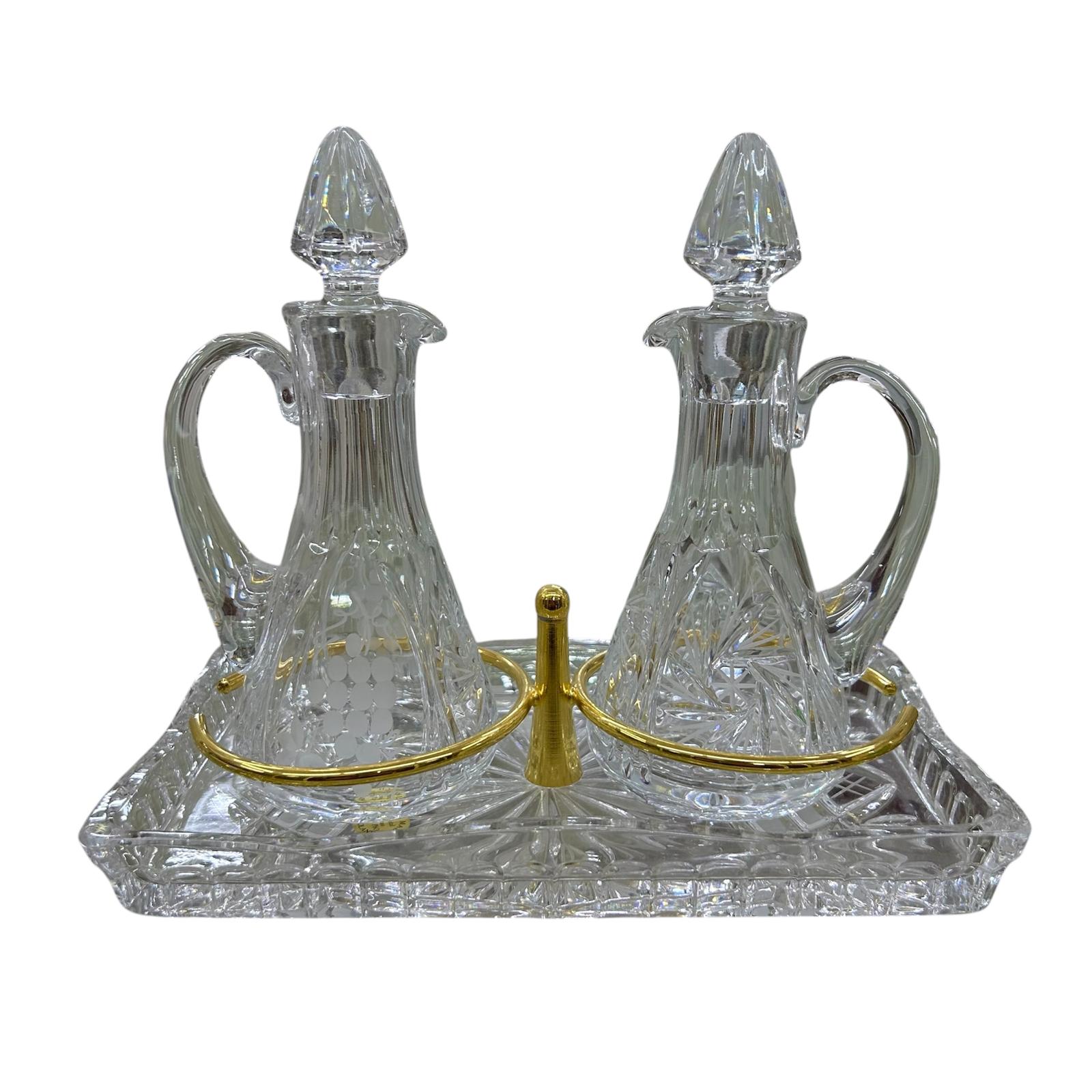 - SET COMPLETO: Include due ampolle in cristallo, vassoio coordinato con supporto centrale dorato per una presentazione raffinata