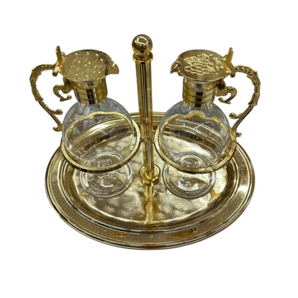 Questo elegante set di ampolline liturgiche è un capolavoro di artigianato che unisce vetro e metallo dorato in un design classico e raffinato. Il set comprende due ampolline in vetro cristallino con decorative maniglie in metallo dorato finemente lavorate in stile barocco. Ogni ampollina misura 16 cm in altezza ed è dotata di un coperchio decorativo in metallo dorato con incisioni artistiche. Le ampolline sono montate su un elegante vassoio dorato dalle dimensioni di 23×18 cm, caratterizzato da una finitura a motivi circolari incisi e un’impugnatura centrale che facilita il trasporto. Il vassoio presenta bordi rialzati finemente lavorati e anelli di supporto per mantenere le ampolline stabili e sicure. Questo set è ideale per l’uso liturgico o come raffinato elemento decorativo per la tavola in occasioni speciali. La combinazione di vetro trasparente e finiture dorate conferisce al set un aspetto lussuoso e solenne.