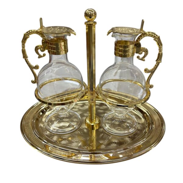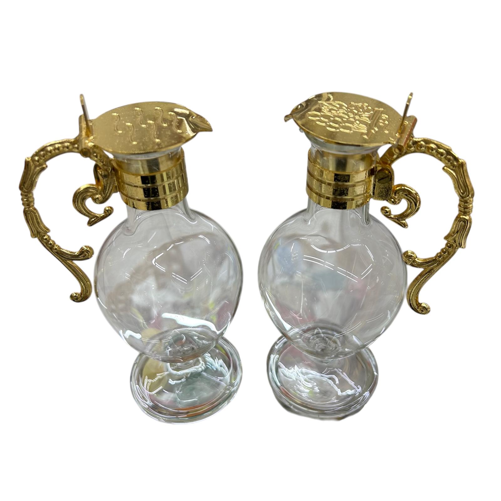 - DESIGN ELEGANTE: Set di ampolline liturgiche in vetro con decorazioni in metallo dorato e manici ornamentali, perfette per uso cerimoniale
