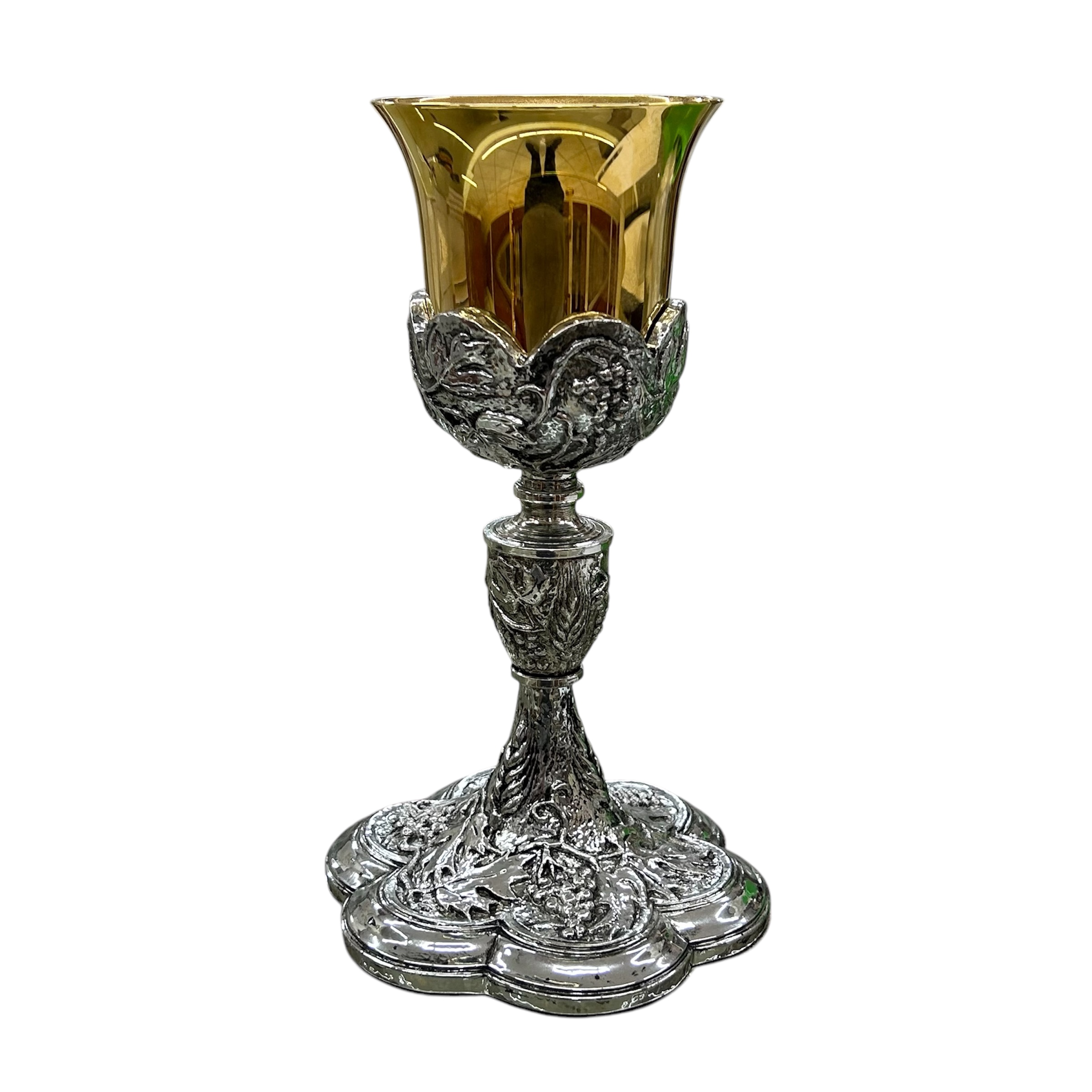 Questo magnifico calice decorativo è un’opera d’arte che unisce eleganza e raffinatezza. Alto 23 centimetri, con un diametro della coppa di 9 centimetri, presenta una lavorazione artigianale di pregio con dettagli in rilievo raffiguranti grappoli d’uva e spighe di grano. La base è caratterizzata da un design a petali finemente decorato con motivi naturalistici, mentre il fusto presenta una lavorazione intricata che si estende fino alla coppa. La parte superiore in vetro ambrato crea un affascinante contrasto con la finitura argentata della struttura. Ogni elemento decorativo è stato meticolosamente realizzato per creare un pezzo d’arredo che cattura l’attenzione e aggiunge un tocco di classe a qualsiasi ambiente. Ideale come centrotavola o come elemento decorativo per occasioni speciali, questo calice rappresenta una perfetta fusione tra funzionalità e design artistico.