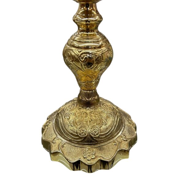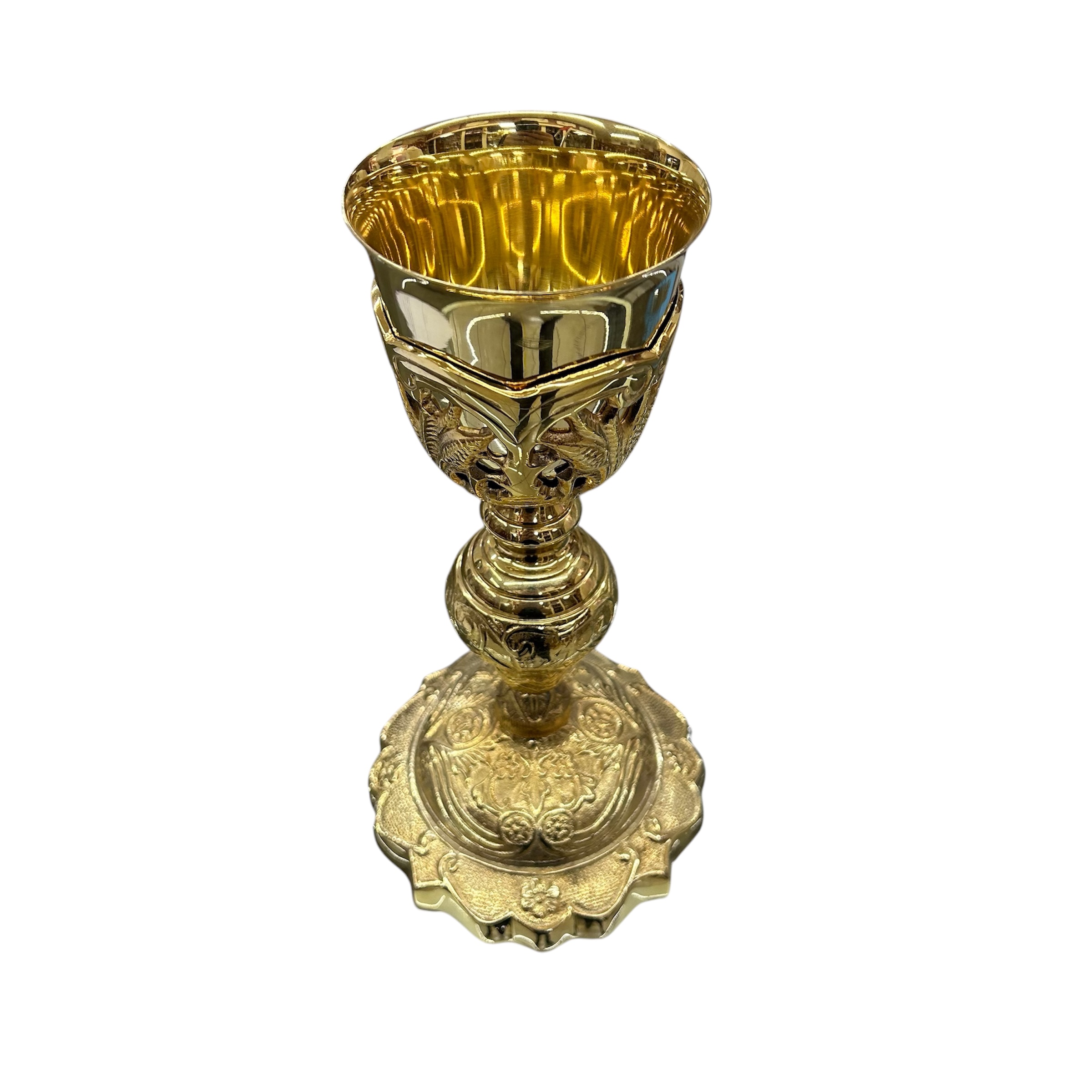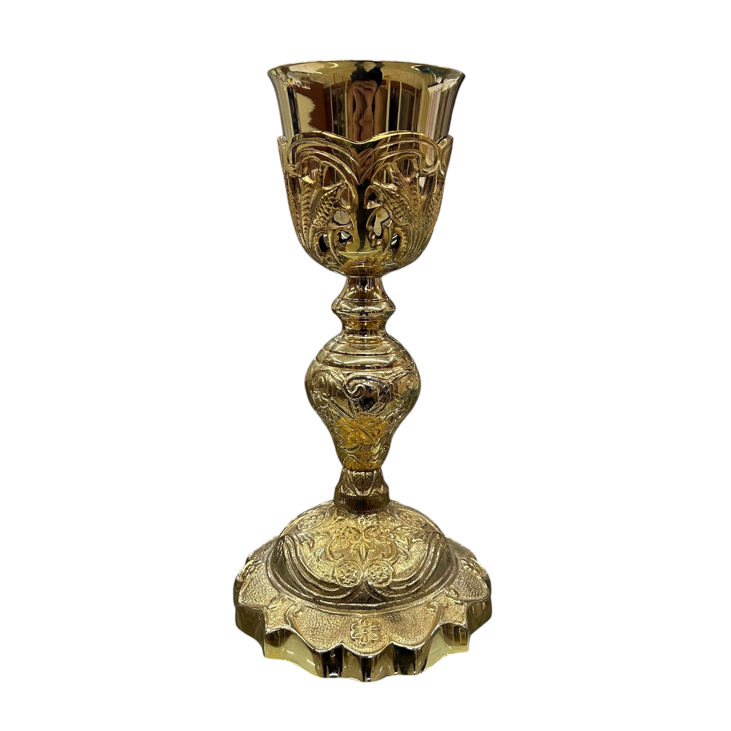 Questo magnifico calice decorativo in ottone placcato oro è un’opera d’arte che unisce eleganza e raffinatezza. Con un’altezza di 26 centimetri e un diametro della coppa di 8,5 centimetri, questo pezzo presenta dettagli intricati e motivi ornamentali finemente lavorati su tutta la superficie. La base ampia e decorata garantisce stabilità, mentre il fusto elaborato presenta motivi floreali e geometrici in rilievo che culminano nella coppa dalla capacità di 0,2 litri. La finitura placcata oro conferisce un aspetto lussuoso e regale, riflettendo la luce in modo spettacolare. Ogni elemento, dalla base scanalata alla coppa finemente cesellata, è stato realizzato con estrema attenzione ai dettagli. Questo calice non è solo un contenitore, ma un vero e proprio elemento decorativo che aggiungerà un tocco di classe a qualsiasi ambiente, perfetto per occasioni speciali o come pezzo da esposizione in una vetrina.