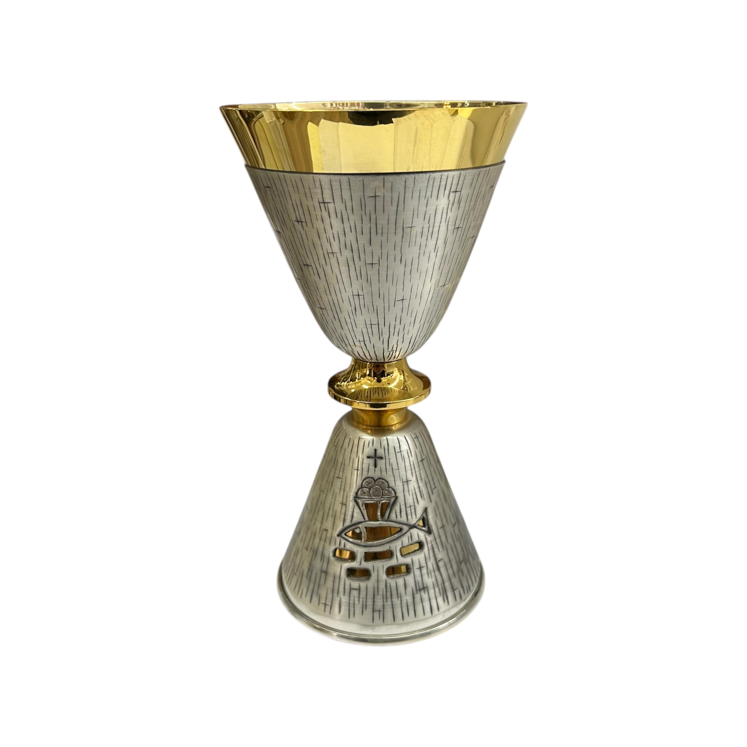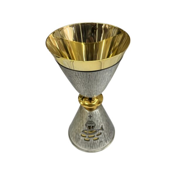 - DESIGN ELEGANTE: Calice liturgico in metallo con finitura bicolore argento e oro, decorato con motivi religiosi incisi e simboli cristiani