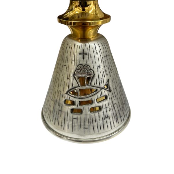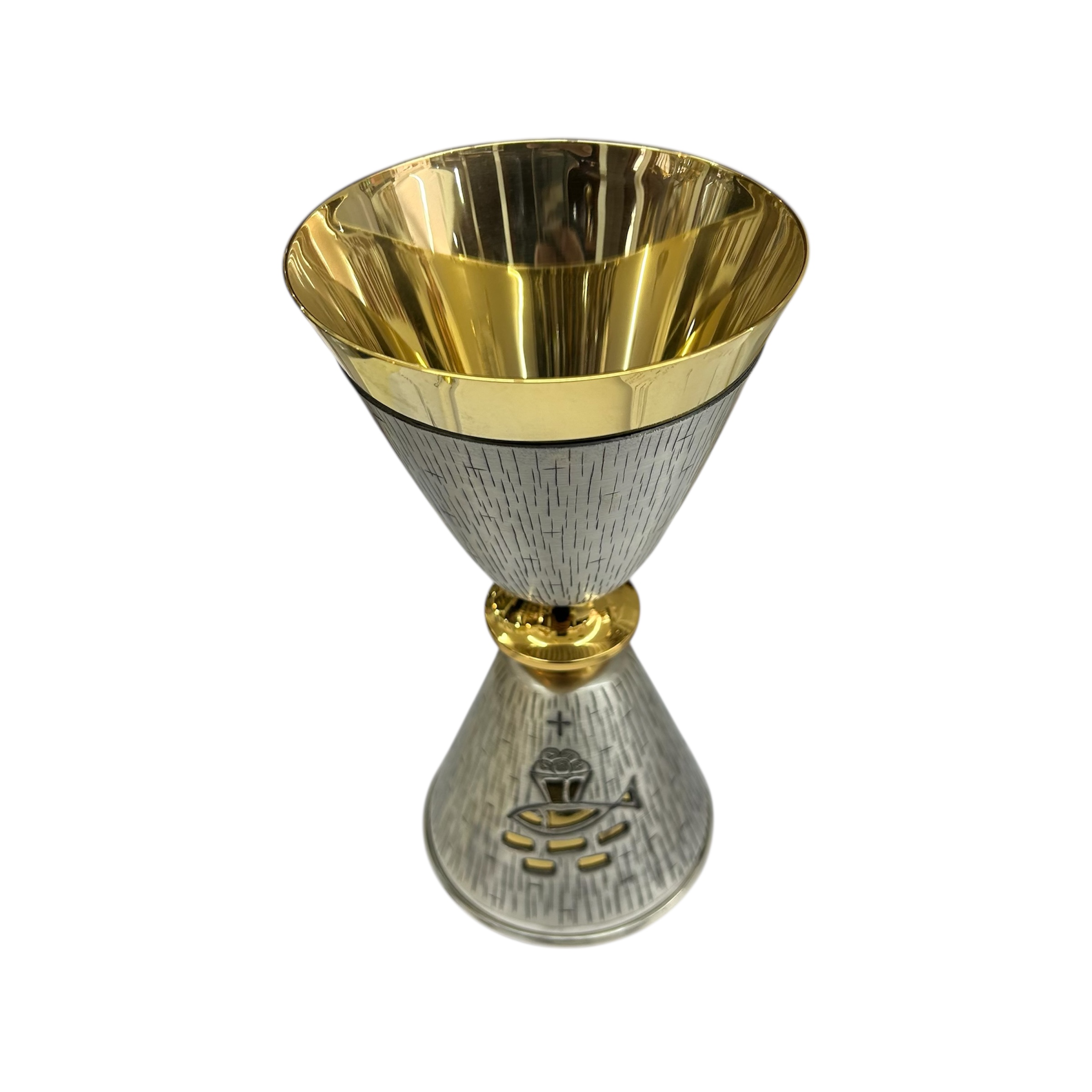 Questo magnifico calice liturgico è un’opera d’arte sacra realizzata con maestria artigianale. Alto 19 centimetri, presenta una coppa dal diametro di 10 centimetri rifinita in elegante doratura che conferisce solennità al suo utilizzo. La base e il fusto sono decorati con un raffinato motivo a linee incise che crea un effetto texture particolare. Il design è impreziosito da simboli religiosi finemente incisi: un pesce stilizzato, un calice e una croce, elementi iconografici della tradizione cristiana. La combinazione di metallo argentato e finiture dorate crea un contrasto armonioso che esalta la preziosità dell’oggetto. La struttura bilanciata e la lavorazione accurata garantiscono stabilità e durata nel tempo, rendendolo perfetto per le celebrazioni liturgiche. Un’opera che unisce funzionalità e bellezza, realizzata nel rispetto della tradizione sacra.