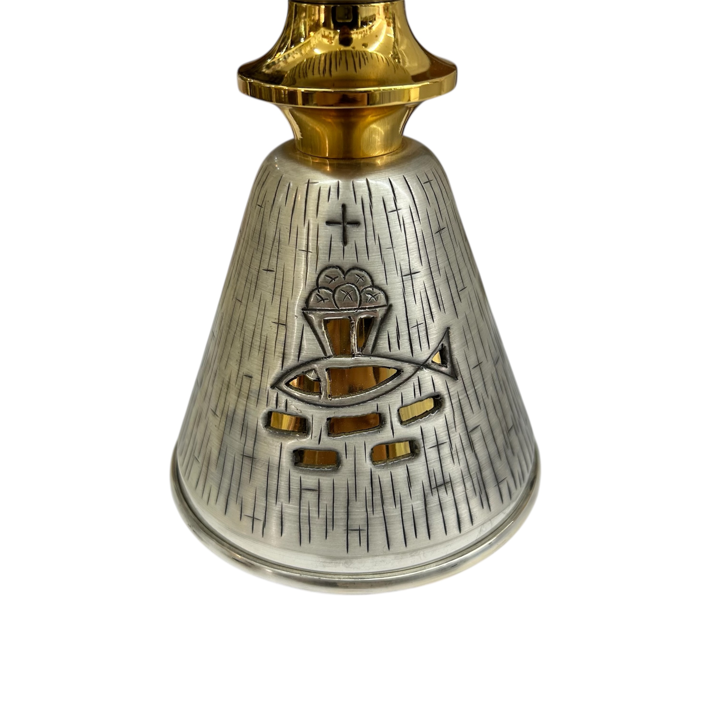 - DETTAGLI ARTISTICI: Base decorata con motivo a raggi incisi e simboli eucaristici, tra cui il pesce e il pane, finemente lavorati