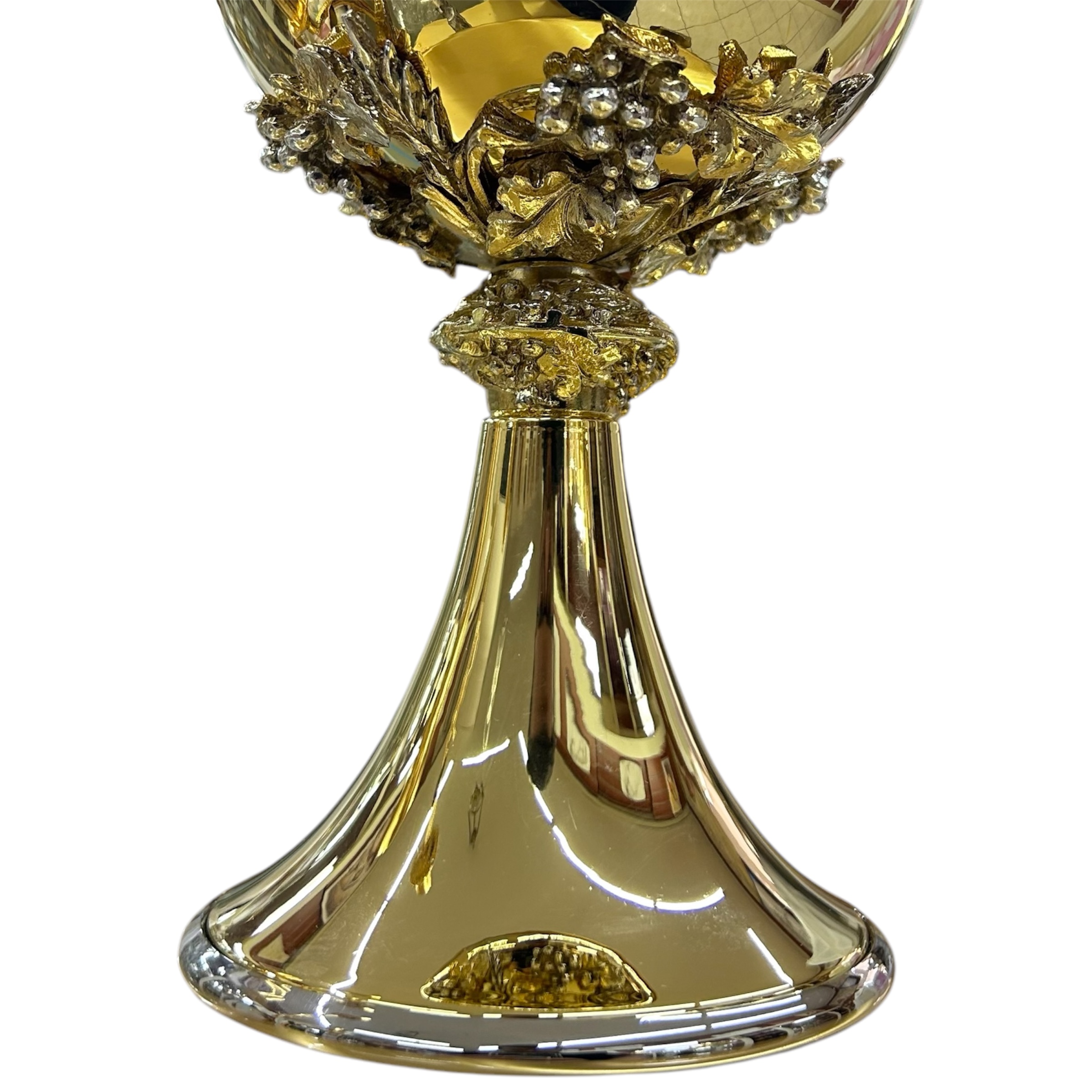 Questa elegante pisside dorata è un capolavoro di arte liturgica, perfetta per le celebrazioni sacre. Con un’altezza di 20 centimetri e un diametro di 11 centimetri, offre una capiente custodia per fino a 150 particole. Il design è impreziosito da raffinati dettagli floreali in rilievo che circondano la coppa, conferendo all’oggetto un aspetto maestoso e solenne. La finitura dorata lucida riflette splendidamente la luce, mentre la croce sulla sommità del coperchio simboleggia la sua sacra funzione. La base svasata assicura stabilità e equilibrio, mentre la lavorazione accurata del metallo garantisce durata nel tempo. L’intreccio di elementi decorativi sulla coppa crea un effetto visivo di grande impatto, rendendo questa pisside un oggetto liturgico di pregevole fattura. Il coperchio rimovibile è stato progettato per una perfetta chiusura e facilità d’uso durante le celebrazioni.