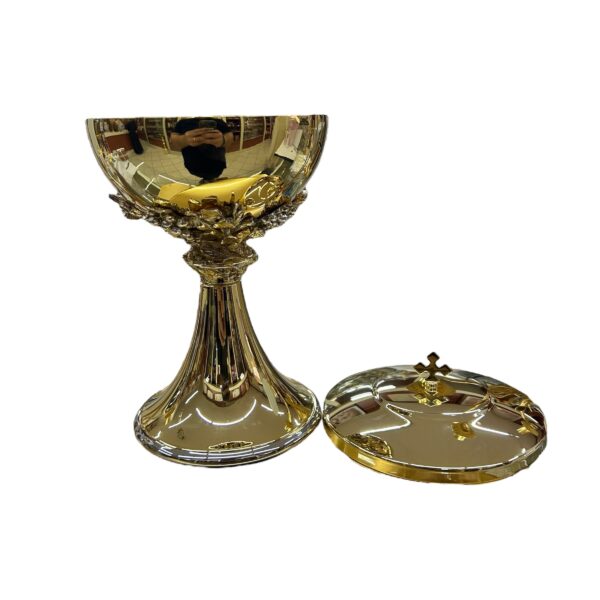 Pisside Dorata con Croce, Ø 11 cm, Altezza 20 cm, Capacità 150 Particole, Decorazione vigneto