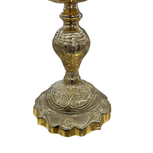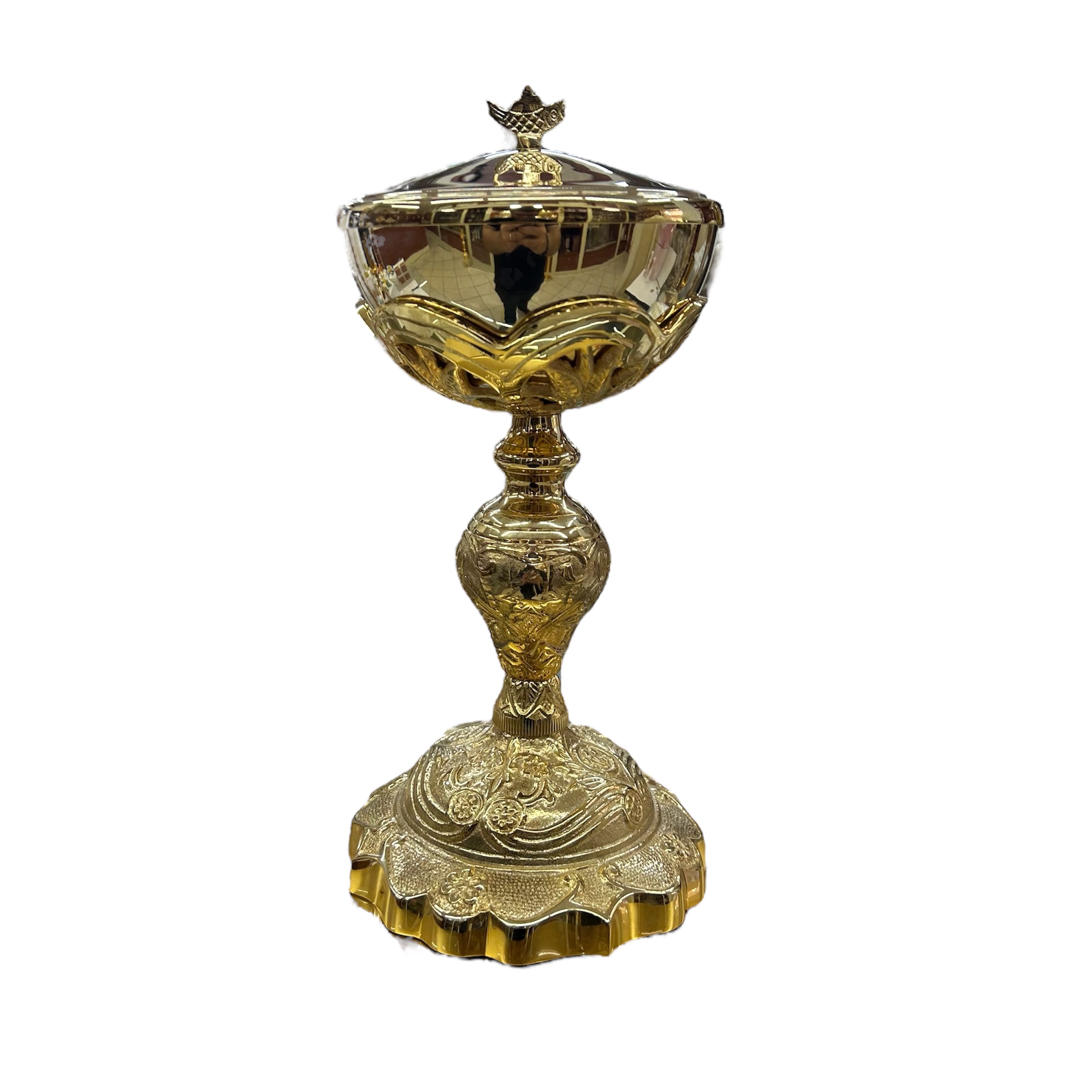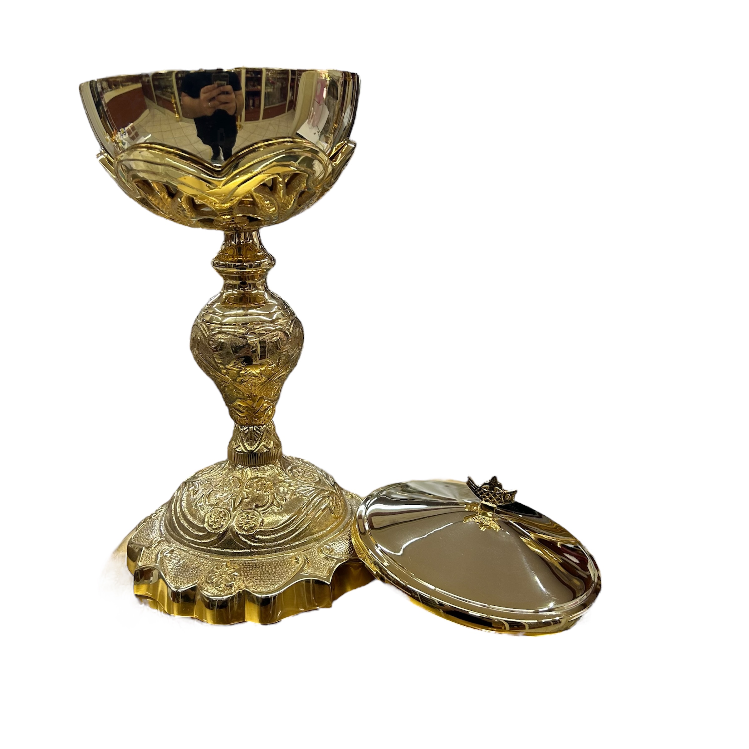 Questa elegante pisside è un capolavoro di artigianato liturgico, realizzata in ottone di alta qualità e impreziosita da una raffinata placcatura in oro. Il design presenta dettagli finemente cesellati sulla base scanalata e sul corpo, con motivi decorativi classici che ne esaltano la solennità. L’altezza complessiva di 27 centimetri e il diametro della coppa di 14,5 centimetri conferiscono all’oggetto proporzioni armoniose e funzionali. La coppa, caratterizzata da una lavorazione a motivi geometrici, può contenere fino a 135 ostie ed è dotata di un coperchio coordinato sormontato da una corona decorativa. La base ampia e stabile assicura un perfetto equilibrio, mentre lo stelo presenta un nodo centrale finemente lavorato che ne facilita la presa durante le celebrazioni liturgiche. Il trattamento superficiale garantisce una finitura brillante e durevole nel tempo, mantenendo inalterata la sua bellezza anche con l’uso frequente. Un oggetto sacro che unisce funzionalità e raffinatezza estetica, ideale per le celebrazioni liturgiche più solenni.