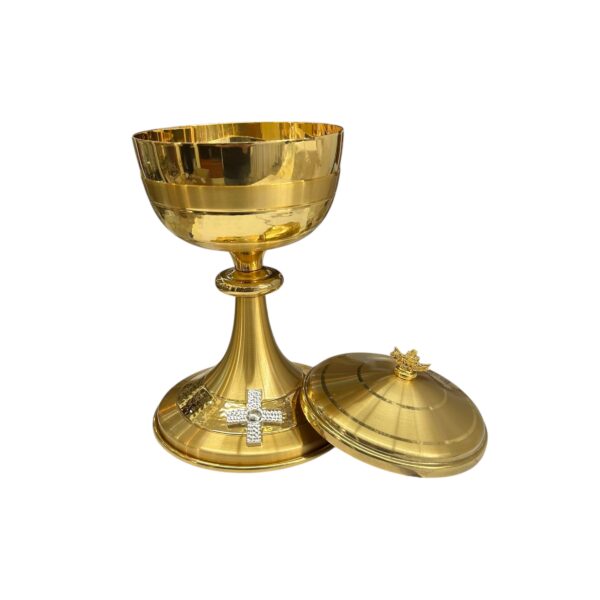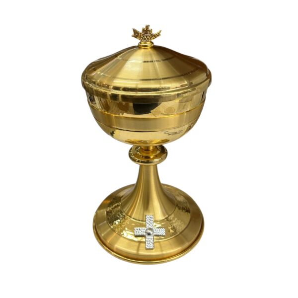 - DESIGN ELEGANTE: Pisside liturgica in ottone dorato con finitura lucida e croce decorativa in argento, ideale per celebrazioni religiose