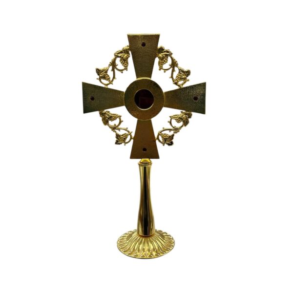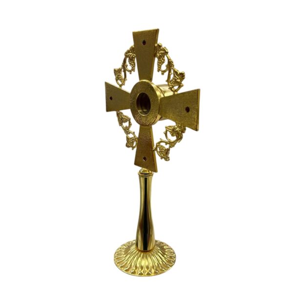 Questo magnifico reliquiario dorato è un’opera d’arte sacra di straordinaria bellezza, caratterizzato da una croce celtica riccamente decorata con motivi d’uva in rilievo. Alto 25 centimetri, il reliquiario si distingue per la sua base ornamentale finemente lavorata con motivi a petali radianti che conferiscono stabilità ed eleganza all’insieme. La croce centrale presenta delicate decorazioni di tralci di vite e grappoli d’uva, simboli ricchi di significato nella tradizione religiosa. Il fusto elegantemente tornito collega la base alla croce superiore, creando una composizione armoniosa. La finitura dorata conferisce all’oggetto un aspetto prezioso e solenne, rendendolo perfetto per l’uso liturgico o come elemento decorativo in contesti sacri. La qualità della lavorazione si evidenzia nei dettagli minuziosi delle decorazioni e nella solidità della struttura complessiva.