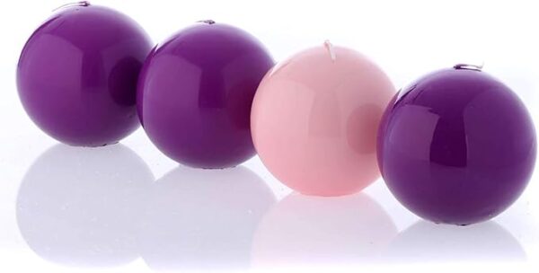 Candele sferiche per Corona dell’Avvento realizzate in raffinata cera italiana e provviste di scatola. La confezione comprende tre sfere di colore viola lucido ed una sfera di colore rosa lucido.