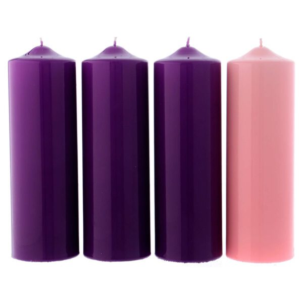Ceri per Corona dell’Avvento realizzati in raffinata cera italiana e inscatolati. La confezione comprende tre candele di colore viola ed una candela di colore rosa.