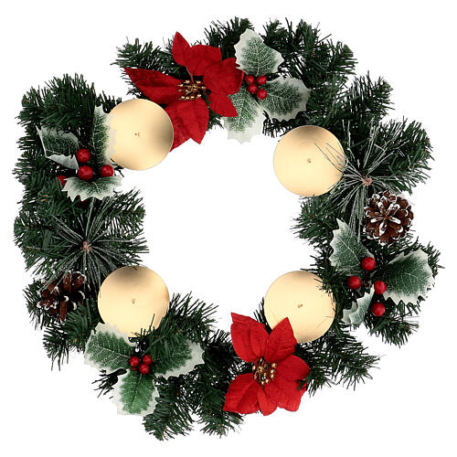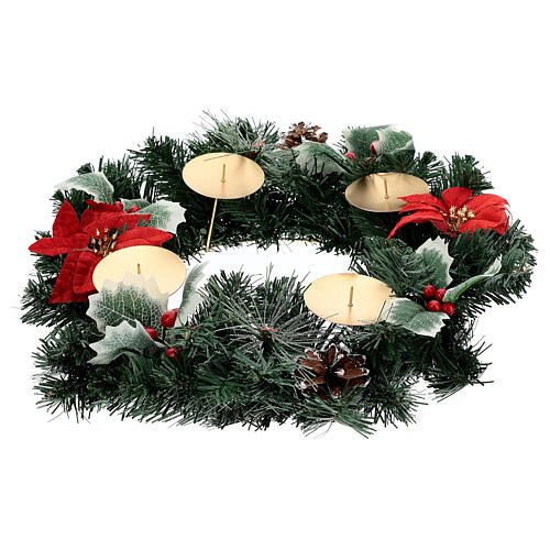 Questa corona dell’Avvento è decorata da pigne, stelle di Natale rosse, foglie e bacche di agrifoglio. È dotata di quattro piatti per candele dorati con punzoni per reggere ceri.