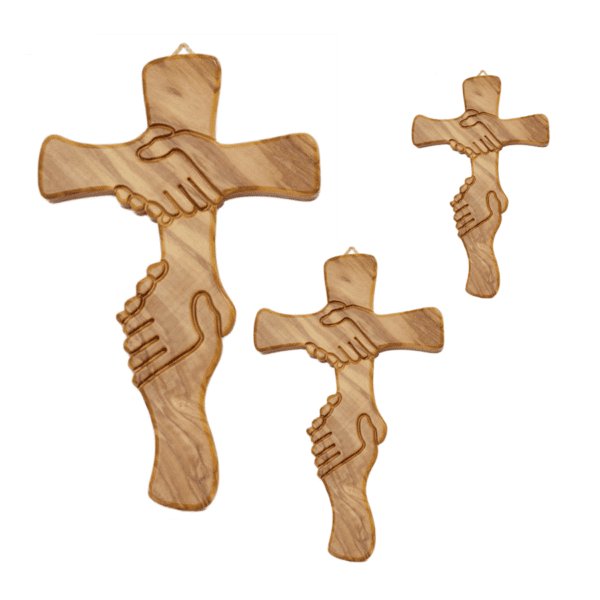 Questa magnifica Croce dell’Amicizia in legno d’ulivo è un’opera d’arte sacra che simboleggia il legame universale tra le persone tre croci di diverse dimensioni, tutte realizzate con pregiato legno d’ulivo, caratterizzato dalle sue venature naturali uniche e dalla calda tonalità dorata. Ogni croce presenta un’incisione raffigurante una stretta di mano, simbolo di amicizia, pace e solidarietà. Queste decorazioni religiose sono perfette per impreziosire le pareti di casa, una cappella o un luogo di preghiera. La lavorazione artigianale conferisce a ogni pezzo un carattere unico e autentico. Le croci sono dotate di un gancio per una facile installazione a parete. Il legno d’ulivo utilizzato dona a queste croci non solo bellezza estetica ma anche grande durevolezza nel tempo. Un regalo significativo per occasioni speciali come battesimi, cresime o matrimoni, o semplicemente per arricchire il proprio spazio sacro con un simbolo di fede e fratellanza.