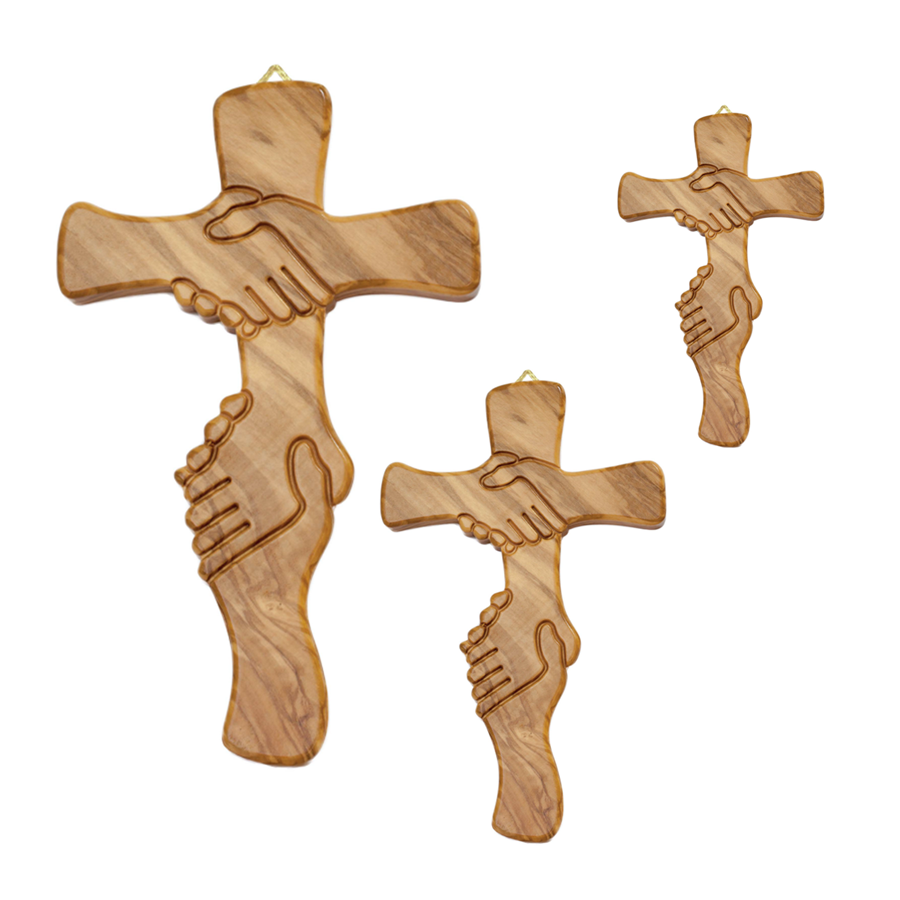- DESIGN ARTIGIANALE: Croce realizzata a mano in pregiato legno d’ulivo, con un simbolico motivo di stretta di mano che rappresenta l’amicizia e la fratellanza