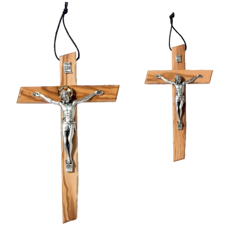 Crocifisso in Legno d’Ulivo con Cristo in Metallo, Croce da Parete con Cordino