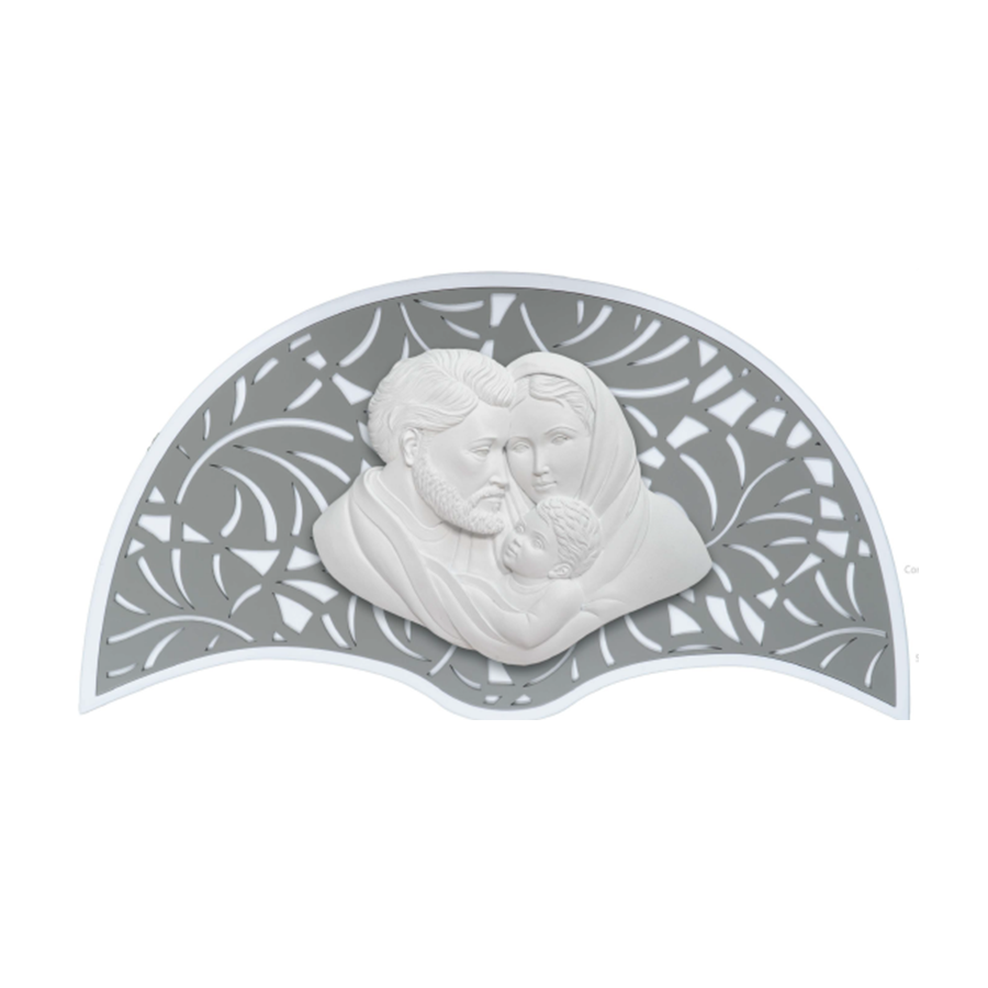 Quadro in legno con placca bianca raffigurante la sacra famiglia con inserti decorati traforati