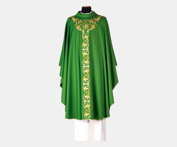 Casula in diverse colorazioni e materiali con ricamo foglie dorate e lettere PAX dimensioni 130×162