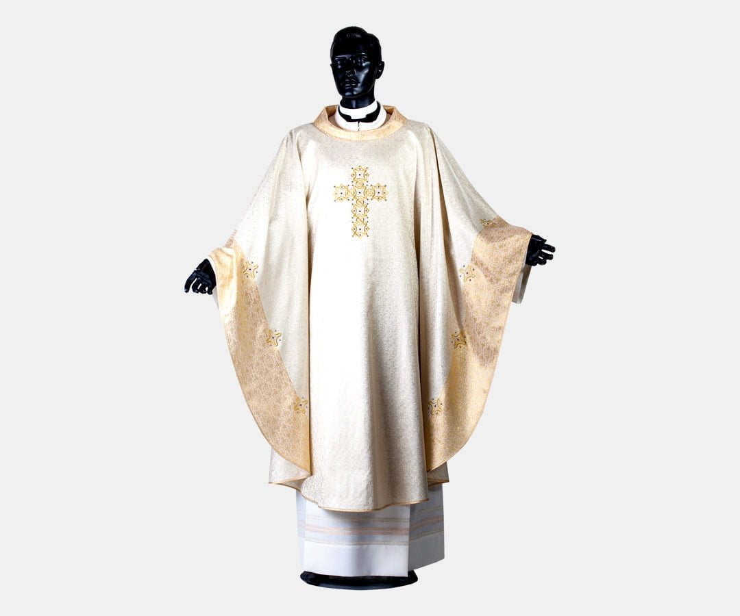 Casula sacerdotale in acetato leggero prodotto dalla cellulosa, con rigatura sull’intera superficie del tessuto, una croce centrale e croci ricamate sul bordo esterno