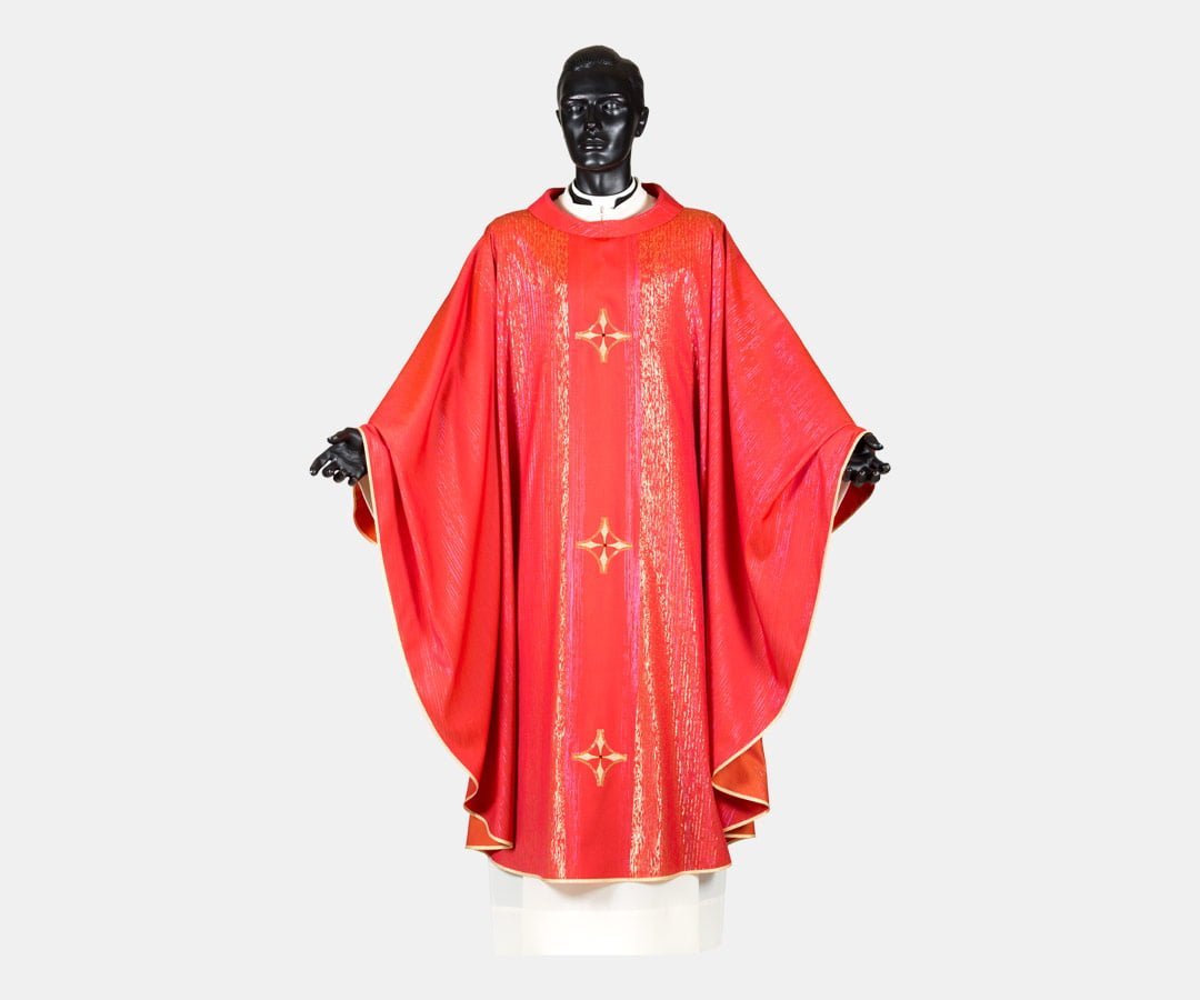 Casula sacerdotale in misto seta, con rigatura sull’intera superficie del tessuto e tre croci ricamate davanti e dietro