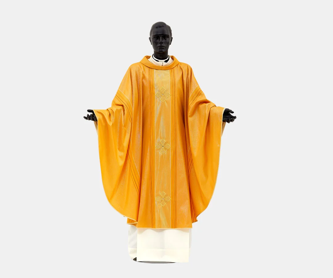 Casula sacerdotale in misto seta, con rigatura sull’intera superficie del tessuto e tre croci ricamate davanti e dietro con inserto di Swarovski