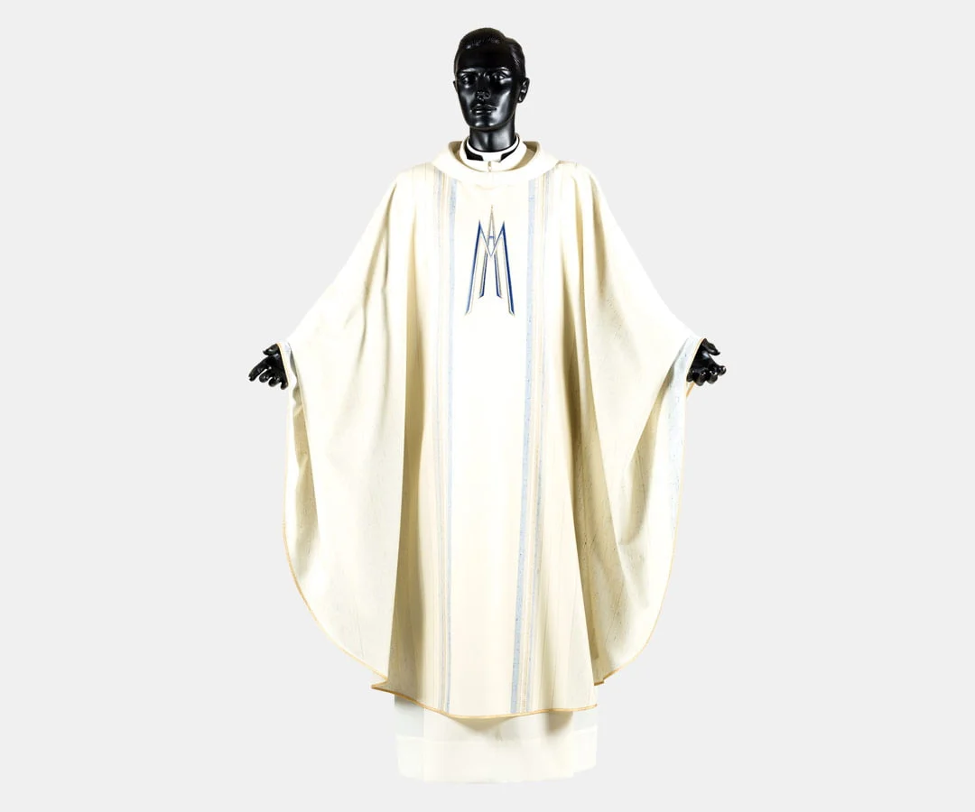 Casula sacerdotale mariana in misto seta, con rigatura sull’intera superficie del tessuto e monogramma mariano