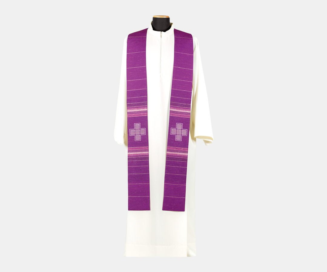 Stola per sacerdote, con tessuto rigato in lana e seta ed indeformabile interno per garantirne forma e durata nel tempo. Materiale: 50% Lana 25% Seta 25% Viscosa
